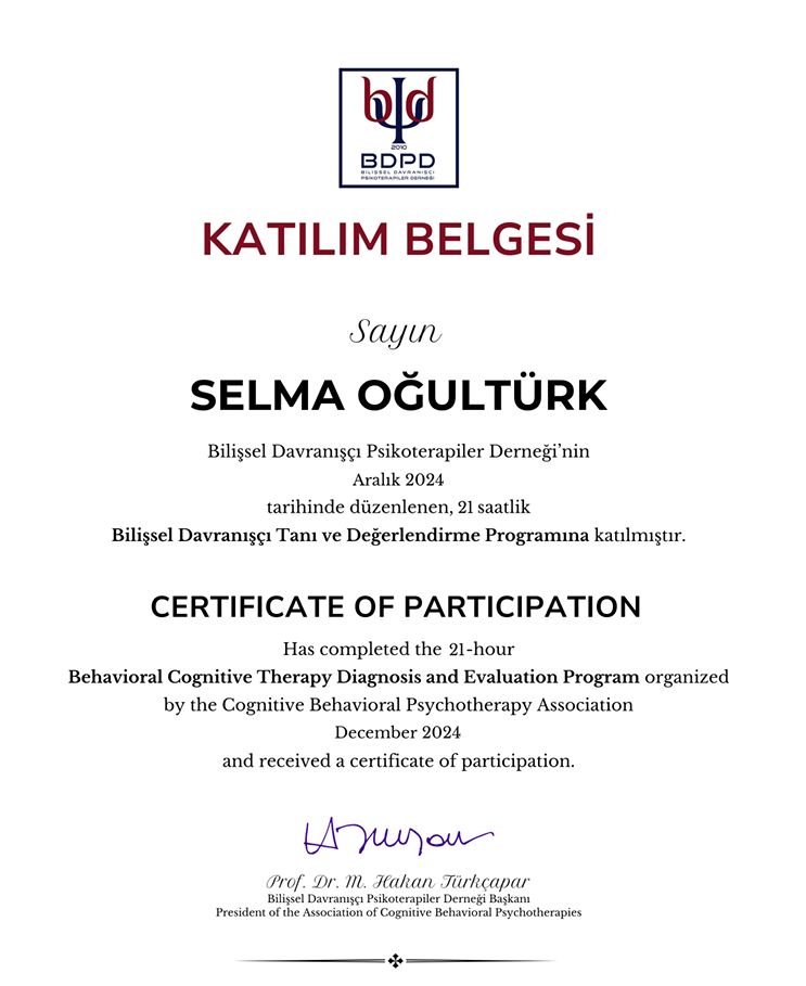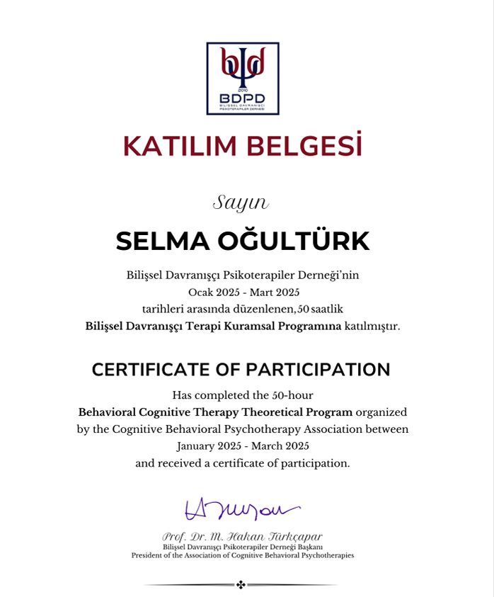 TED Üniversitesi Psikoloji (İngilizce) mezunu bir psikolog olarak; çocuk, ergen ve yetişkinlerle çalışmakta, danışanlarıma bilimsel temelli ve yapılandırılmış bir terapi süreci sunmaktayım. Terapi yaklaşımımın temelini Bilişsel Davranışçı Terapi (BDT) ve Şema Terapi oluşturmaktadır. Çalışmalarımda, yalnızca mevcut belirtileri azaltmayı değil; kişinin düşünce, duygu ve davranış örüntülerini derinlemesine anlayarak kalıcı ve sürdürülebilir değişim sağlamayı hedeflerim.