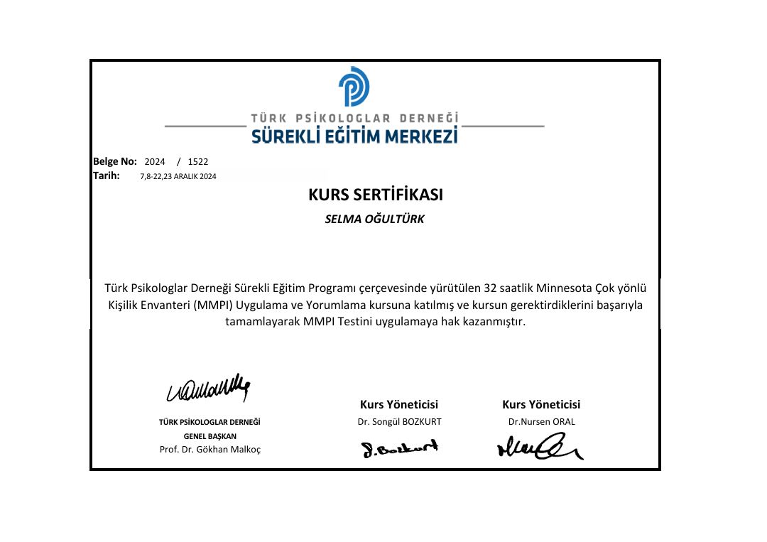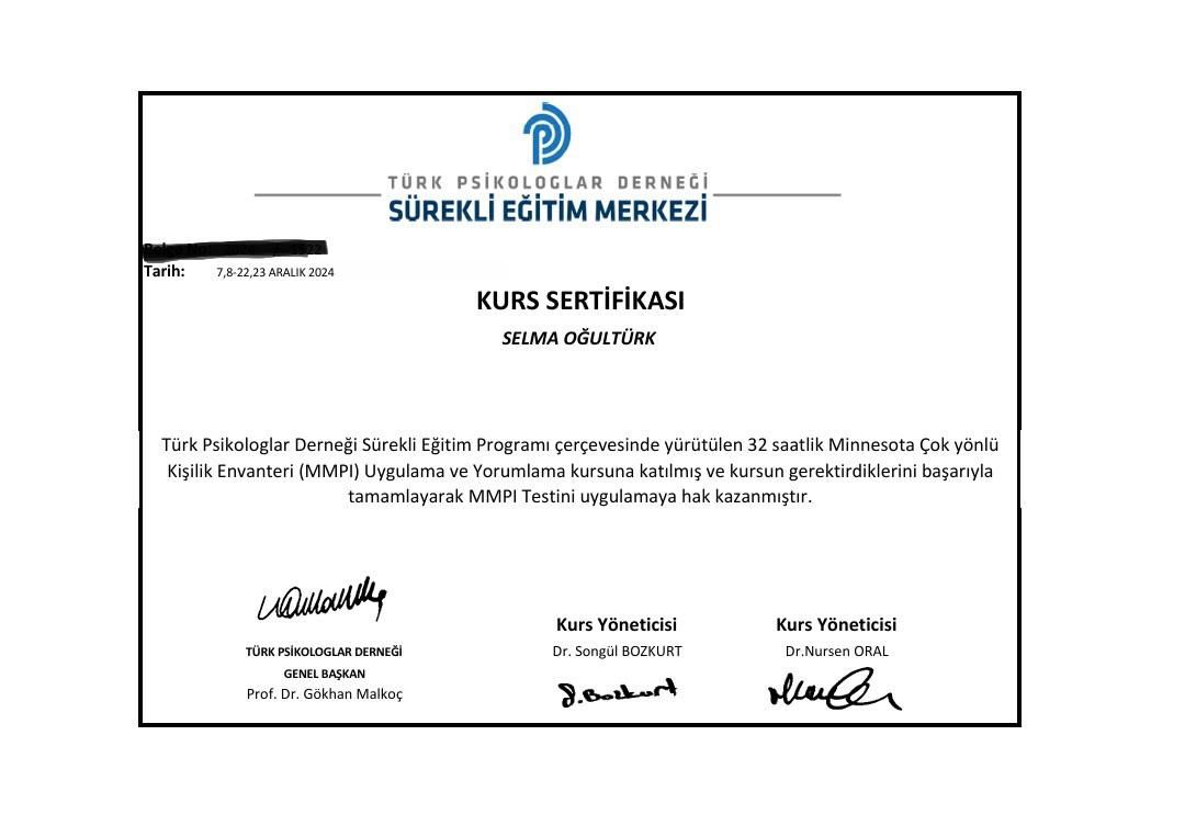 Mesleki pratiğim boyunca bireysel psikoterapi süreçlerinin yanı sıra psikolojik değerlendirme, test uygulamaları ve profesyonel raporlama alanlarında aktif görev aldım. Kurumsal projeler kapsamında yürüttüğüm değerlendirme süreçleri, analitik bakış açımı ve klinik gözlem yetkinliğimi güçlendirmiştir. Ayrıca, MMPI temelli ve tarafımdan geliştirilen özgün ölçme-değerlendirme sistemim sayesinde danışanlarımı objektif, sistematik ve bütüncül bir çerçevede ele alarak kişiye özel müdahale planları oluşturmaktayım.